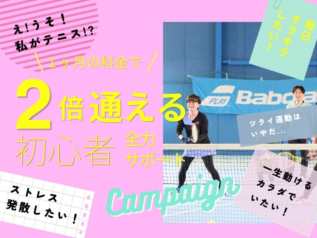 ございます。全くテニス経験のない初心者から学べる「ファースト」クラスは、ラケットの持ち方から基本的なショット(サーブ・ストローク・ボレー・スマッシュ)の打ち方まで楽しく丁寧にレッスンしていきます。